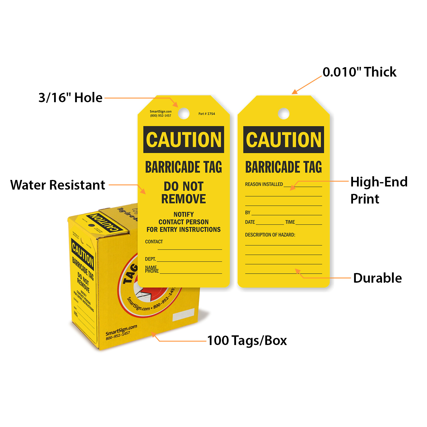 Tag-in-a-Box, Plastic 3" X 6¼”, Caution Barricade Tag: Caution Barricade Tag Do Not Remove, Notify Contact Person, Hazard Tag T-BOX-120 Learn More...