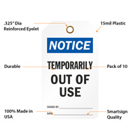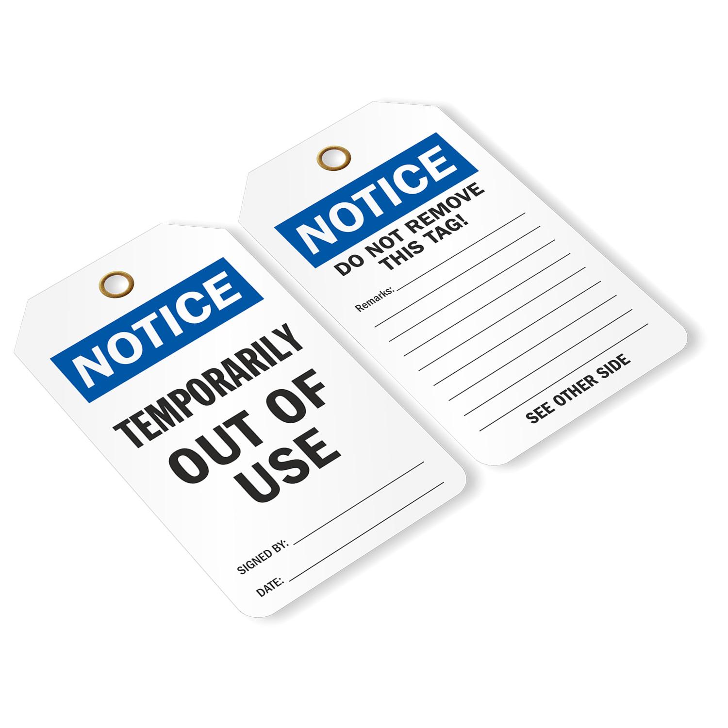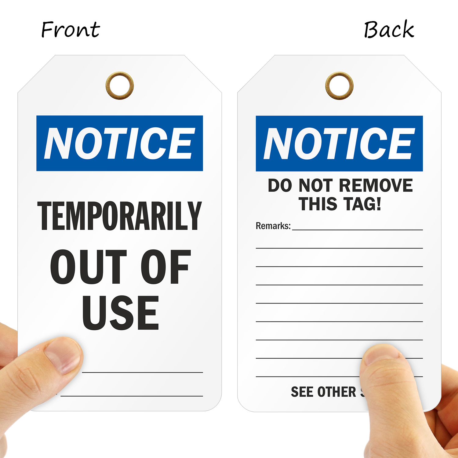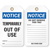 2-Sided OSHA Notice Safety Tag: Temporarily Out Of Use Do Not Remove This Tag TG-0634